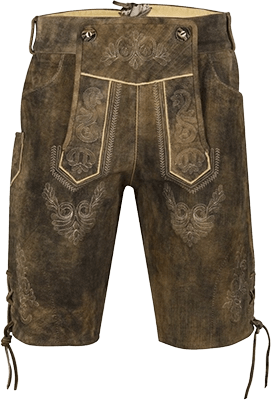 Traditional Bavarian design with a belt and suspenders, perfect for festivals like Oktoberfest.